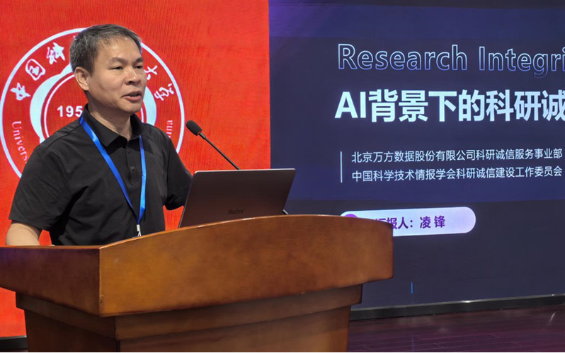 北京万方数据股份有限公司科研诚信事业部总经理、中国科学技术情报学会科研诚信建设工作委员会秘书长凌锋先生作题为《AI时代的科研诚信建设》的报告。他从行业实践与制度建设角度,分享了应对AI时代科研诚信挑战的体系化解决方案与实践经验。凌锋首先根据学术不端典型案例引出我国科研诚信建设的现状问题,他认为科技监督与科研诚信建设工作应持续深化,全方位收紧,积极主动作为,严格执法落实,细化监管手段,并提出面向科研活动“事前-事中-事后”全过程的五大核心服务与三大系统化解决方案。他重点展示了应对AI时代挑战所构建的四大核心服务场景,通过“教育-预防-监督-惩戒”四位一体的治理模式,以权威的数据资源、自主可控的先进技术和场景化的解决方案,赋能高校及科研机构构建闭环的科研诚信治理体系。
